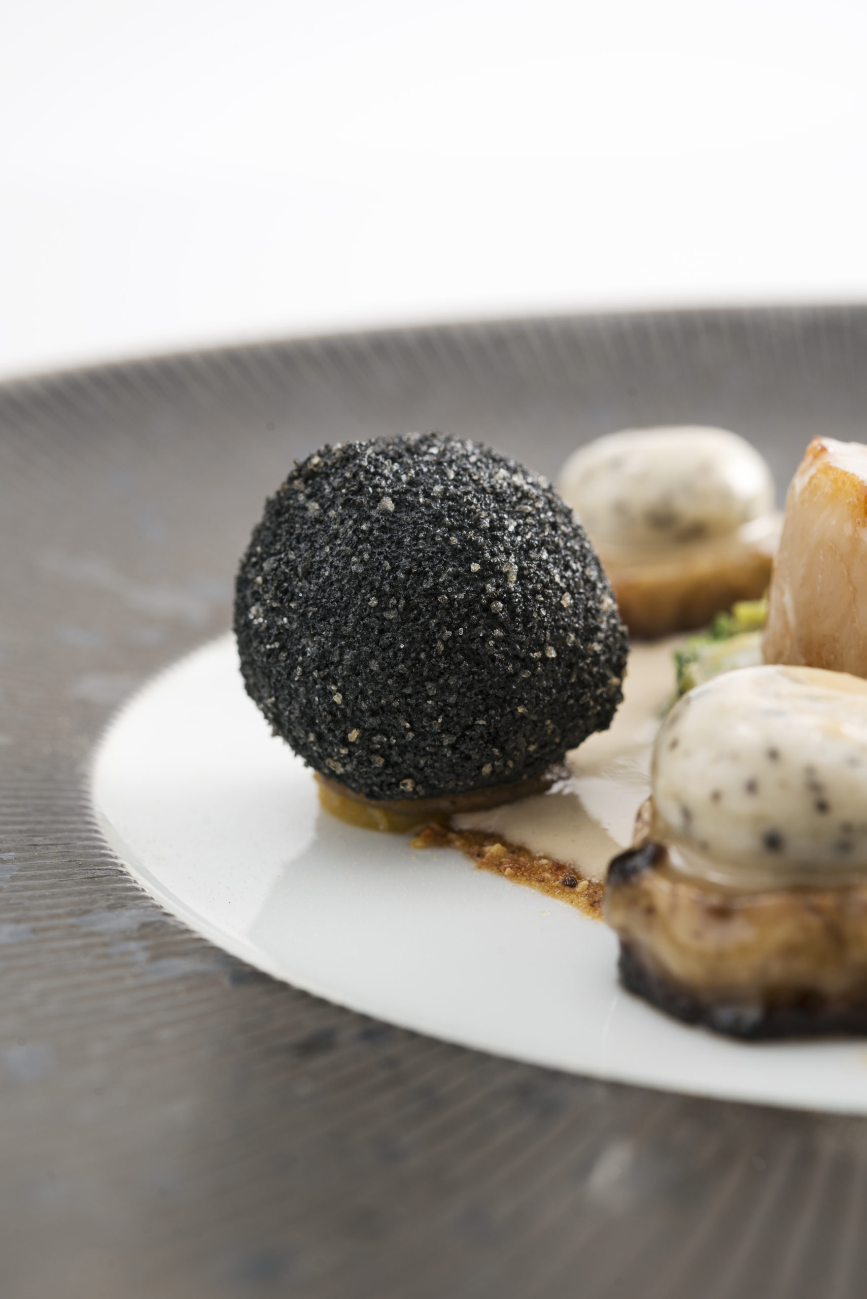 Autour, enfin, un cromesquis noir, composé d’une croquette de barbes et de corail de Saint-Jacques au citron et persil, roulé dans une chapelure de pain à l’encre de seiche.