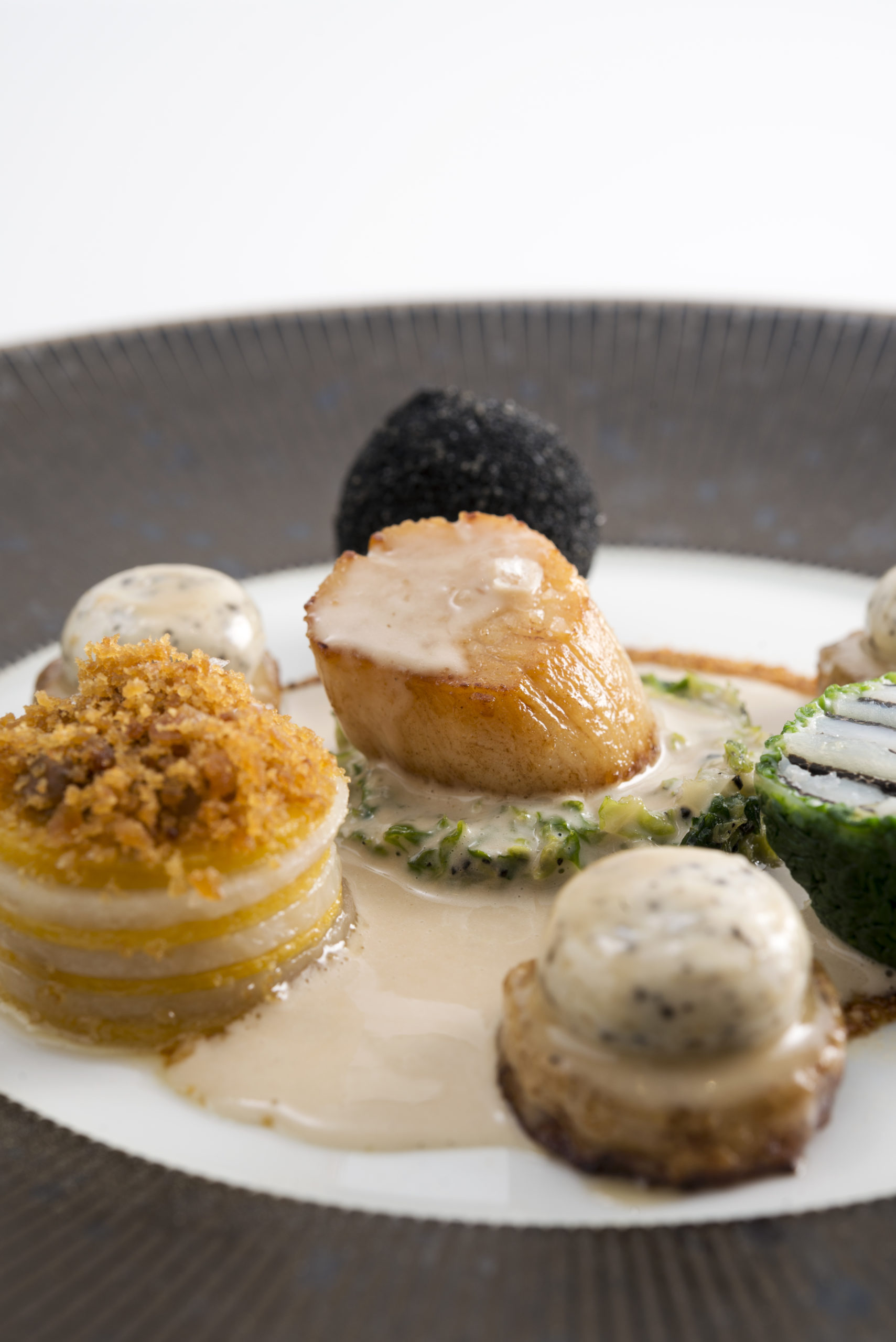 Autour, trois palets de céleri rave confits au beurre qui soutiennent une bille de mousseline à la Saint-Jacques et à la truffe, le tout nappé d’une sauce crémée complexe au thé Earl Grey, aux échalotes, poireaux et champignons étuvés et déglacés au Noilly Prat puis mêlés à la barbe de Saint-Jacques avec une pichenette de bergamote au moment de servir.