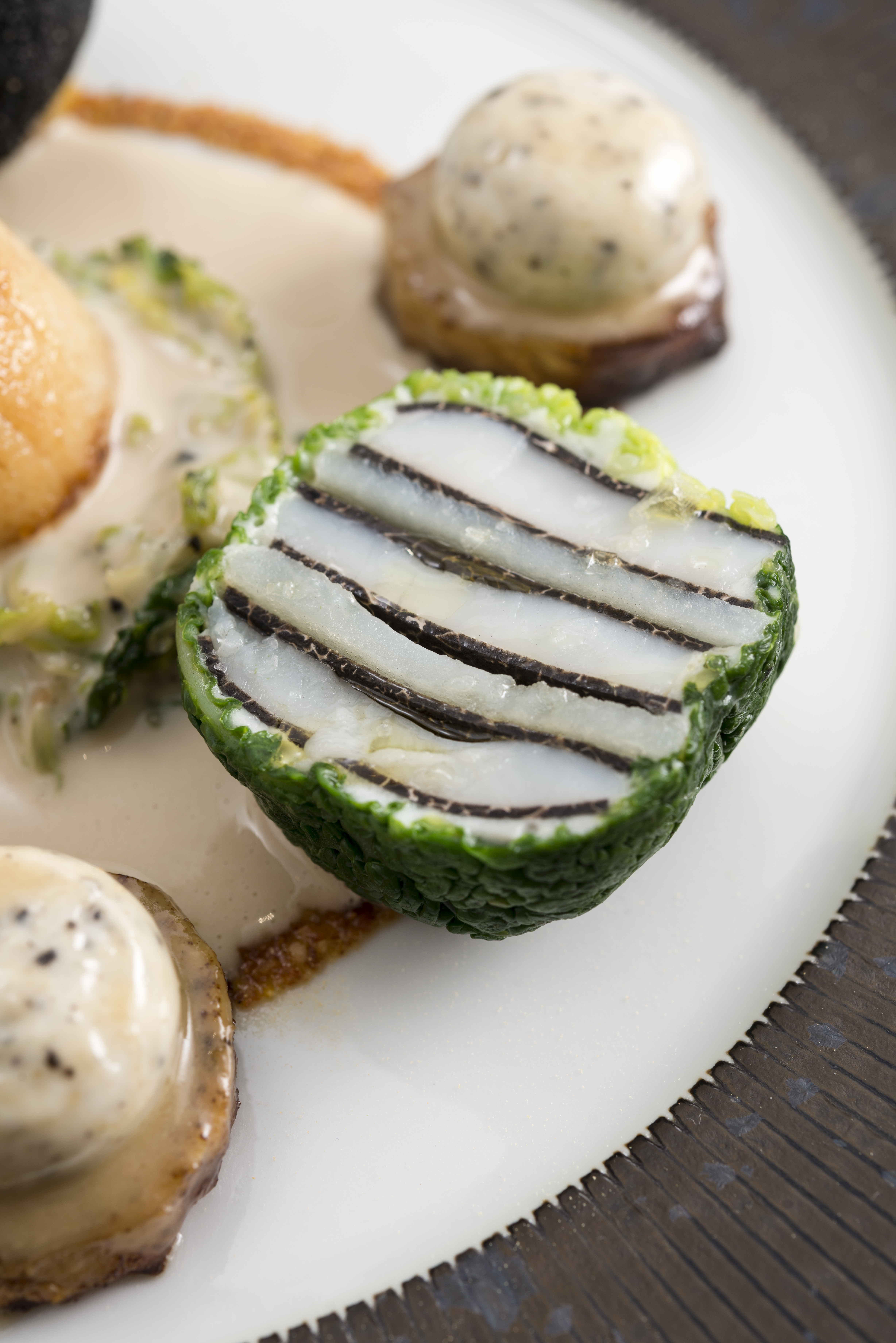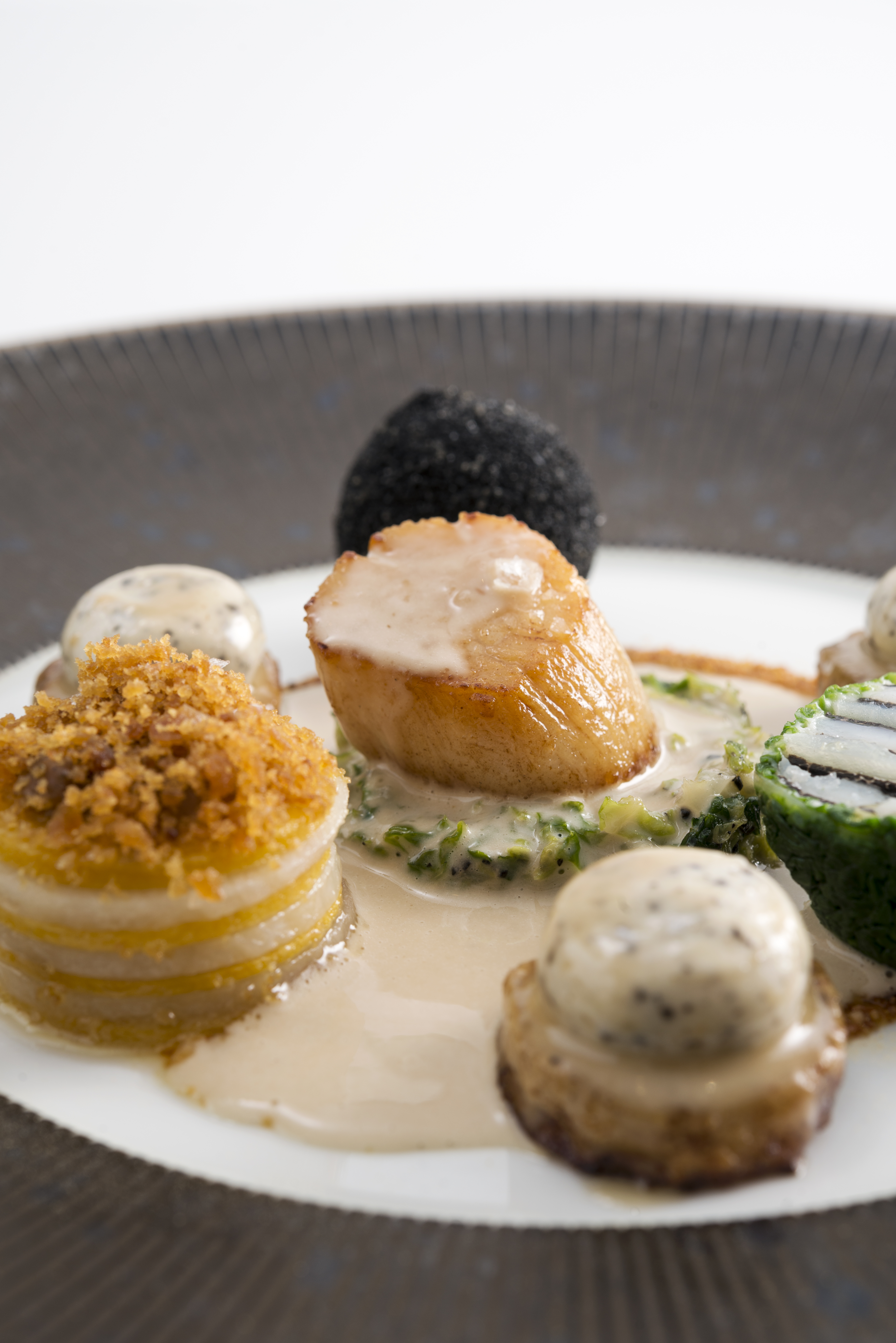 Arranged around it, three celeriac palets stewed in butter bearing a marble of scallop and truffle mousseline, all coated in a sophisticated Earl Grey cream sauce with shallots, leeks and mushrooms steamed and deglazed with Noilly Prat and then mixed with scallop beard and a dash of bergamot before serving. Next, a steamed ballotine of scallops, King Edward potato and truffle. Cut in half, the layers of colour are remarkable. Then, a mille-feuille of rings of potato and Butternut squash, with a filling consisting of caramelized shallot purée and crushed walnuts; And, finally, a black cromesquis, made with a croquette of scallop beards and coral in lemon and parsley, coated in breadcrumbs and squid ink. All of this is set on a circle of walnut oil and pumpkin seed flour. Colours, flavours, a taste of the sea for the palate.