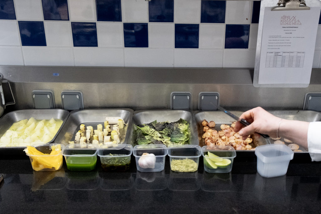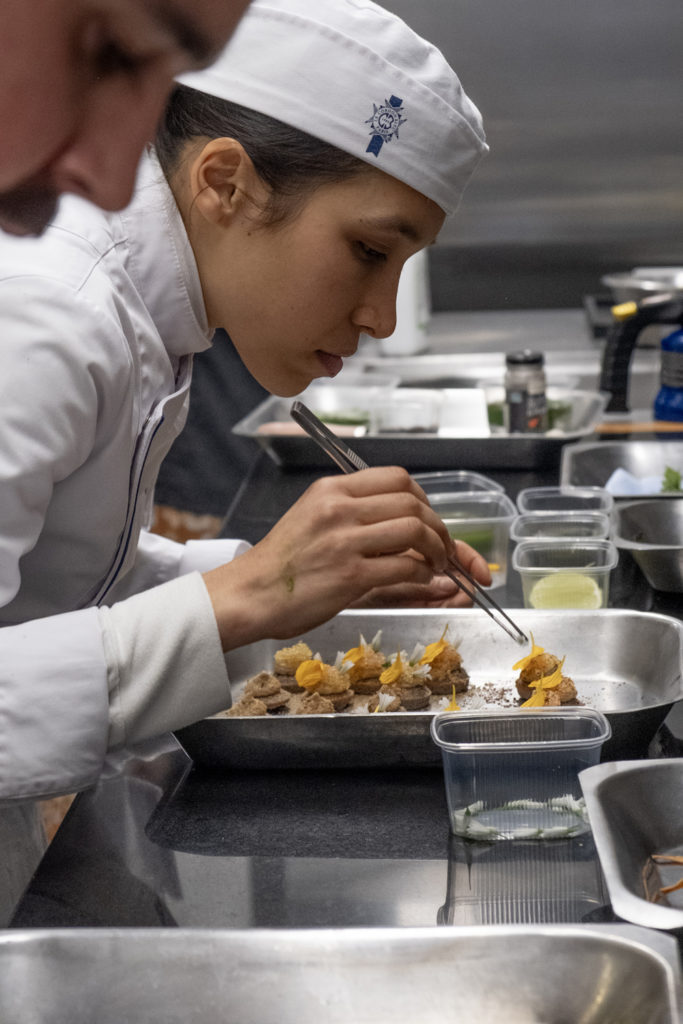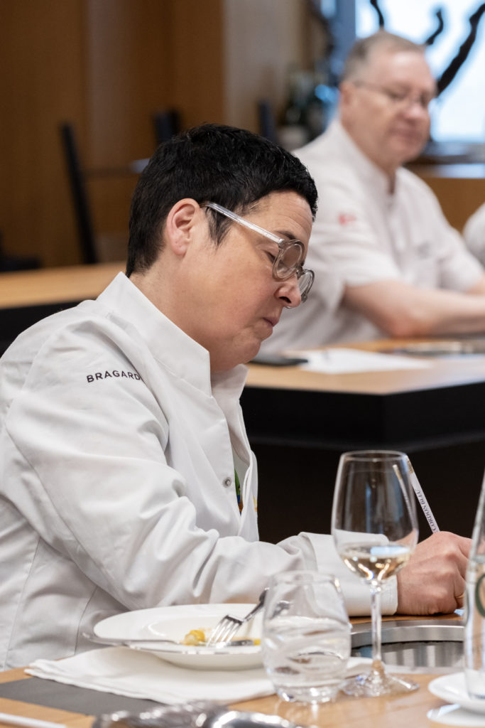 Japanese candidate Yuki Higashizono faces the jury, which observes and comments on the contestants’ behavior in the kitchen.