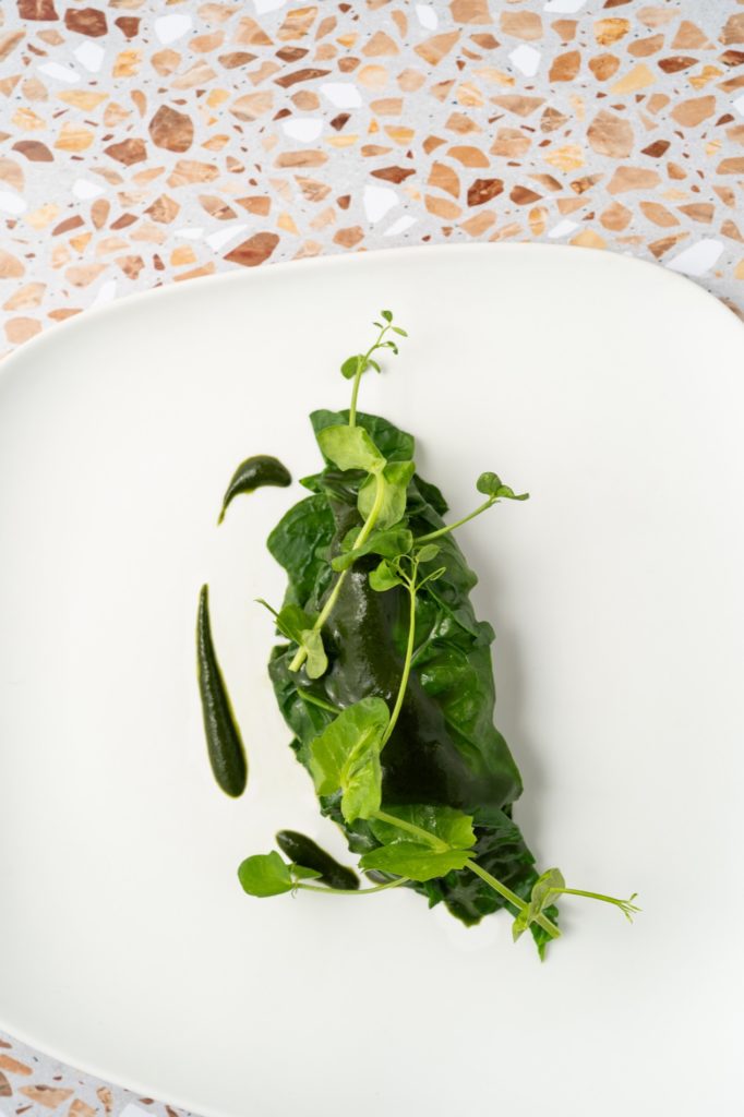 En tant que chef je suis très attaché au lieu, épinard et shiso vert. Il résume bien mon approche, un poisson travaillé sobrement, entouré de quelques notes herbacées et légèrement ferriques, presque à cru. C’est un registre qui m’est familier parce que j’aime profondément travailler le poisson. J’y ai consacré trois années chez Michel Guérard aux trois étoiles, puis en Angleterre près de Brighton avant de développer d’autres techniques au Japon. En dégustation, c’est aussi l’un de mes plats préférés, à la fois délicat, simple, gourmand, bon pour la santé.